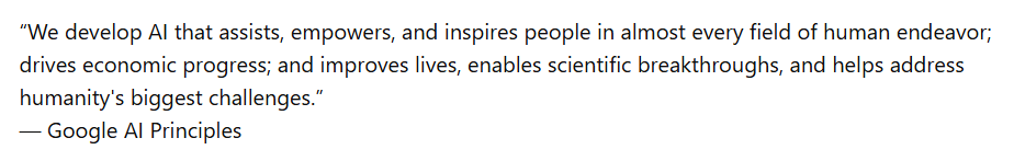 Принципи ШІ Google спрямовані на забезпечення суспільної користі, запобігання упередженості, безпеку, підзвітність, захист приватності, високі наукові стандарти та доступність для допустимого використання. Компанія наголошує на створенні ШІ, який є корисним, справедливим, безпечним, приватним, дотримуючись суворих етичних та професійних стандартів.
